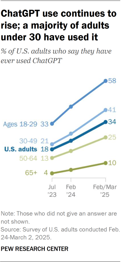 “The share of U.S. adults who have used ChatGPT more than doubled in two years—rising from 14% in 2023 to 34% in 2025.”