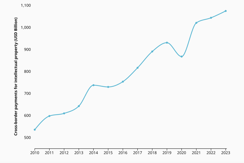 Figure 1: Cross-border payments for the export and import of intellectual property, in USD Billion, 2010-2023