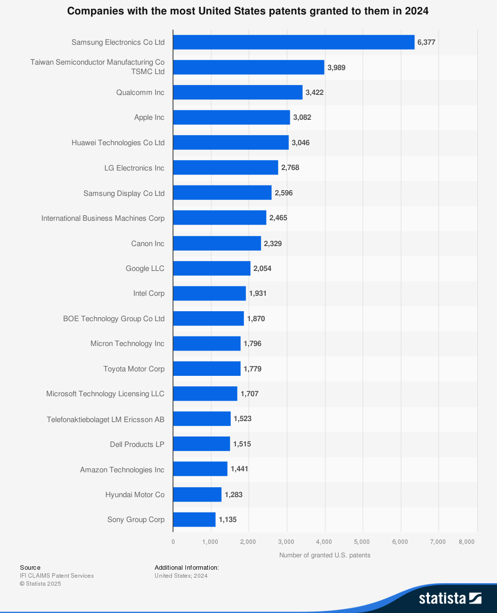 The concentration of value becomes clear when examining patent ownership. Samsung Electronics led U.S. patent grants in 2023, with 6,165 patents, while the United States granted 174,820 patents domestically. Japan followed with 40,785 patents.