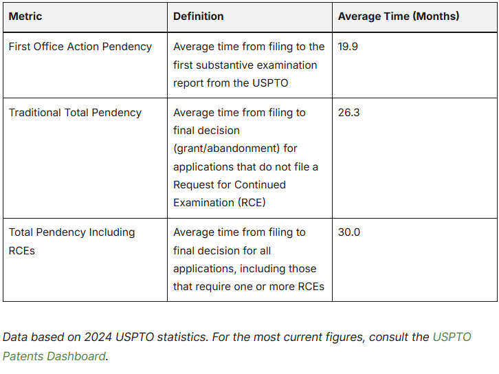How long does the patent process take? Current USPTO averages indicate 16-18 months for the first Office Action, with an overall pendency of around 23 months to final decision. Expedited examination options like Track One can reduce this to 12 months for additional fees.