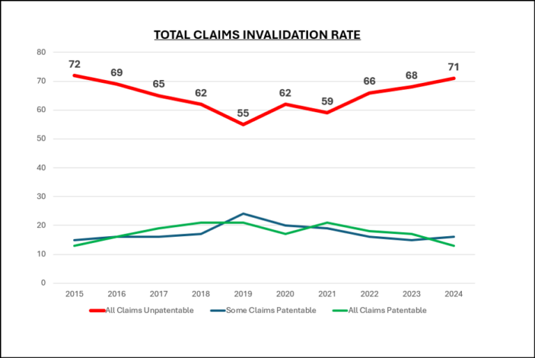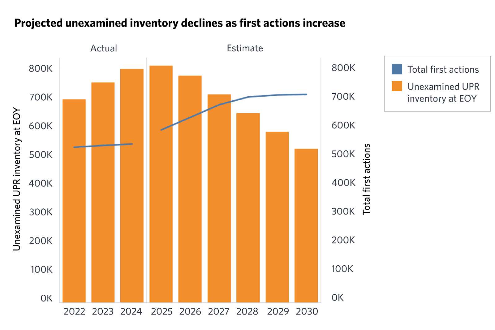 As illustrated in the figure below, the USPTO’s patent backlog peaked around 800,000 in FY 2024. However, the number of first Office Actions issued has also reached record highs (over 545,000 in FY 2024), reflecting the agency’s strategic focus on increasing examiner productivity and reducing pendency.