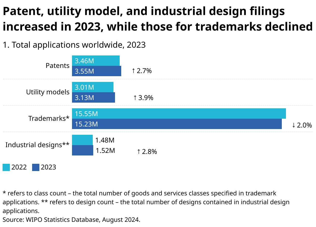 Together, the US, China, Japan, Korea, and EPO accounted for about 85% of all patent filings in 2023. In fact, China alone contributes nearly half of all patent filings worldwide.