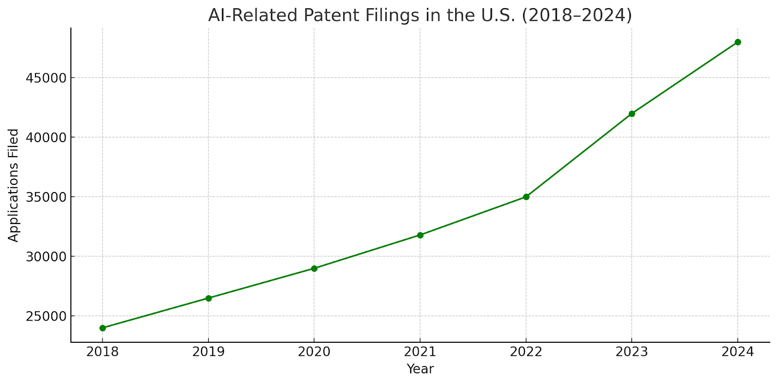Still, tech companies vigorously patent genuine innovations in AI, cloud computing, cybersecurity, etc. According to USPTO data, AI-related patent applications in the U.S. have increased by about 33% since 2018. Moreover, filings for generative AI patents surged over 50% in the past year, surpassing 51,400 filings, reflecting intense competition in that arena.