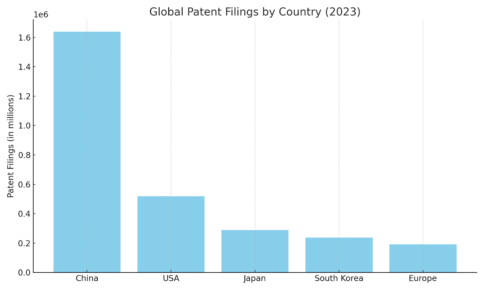 According to the World Intellectual Property Indicators 2024, individuals and entities in China filed approximately 1.64 million patent applications in 2023, significantly higher than any other country, with the U.S. coming in second at about 518,000 filings. This figure reinforces China’s dominant lead in global patent activity..